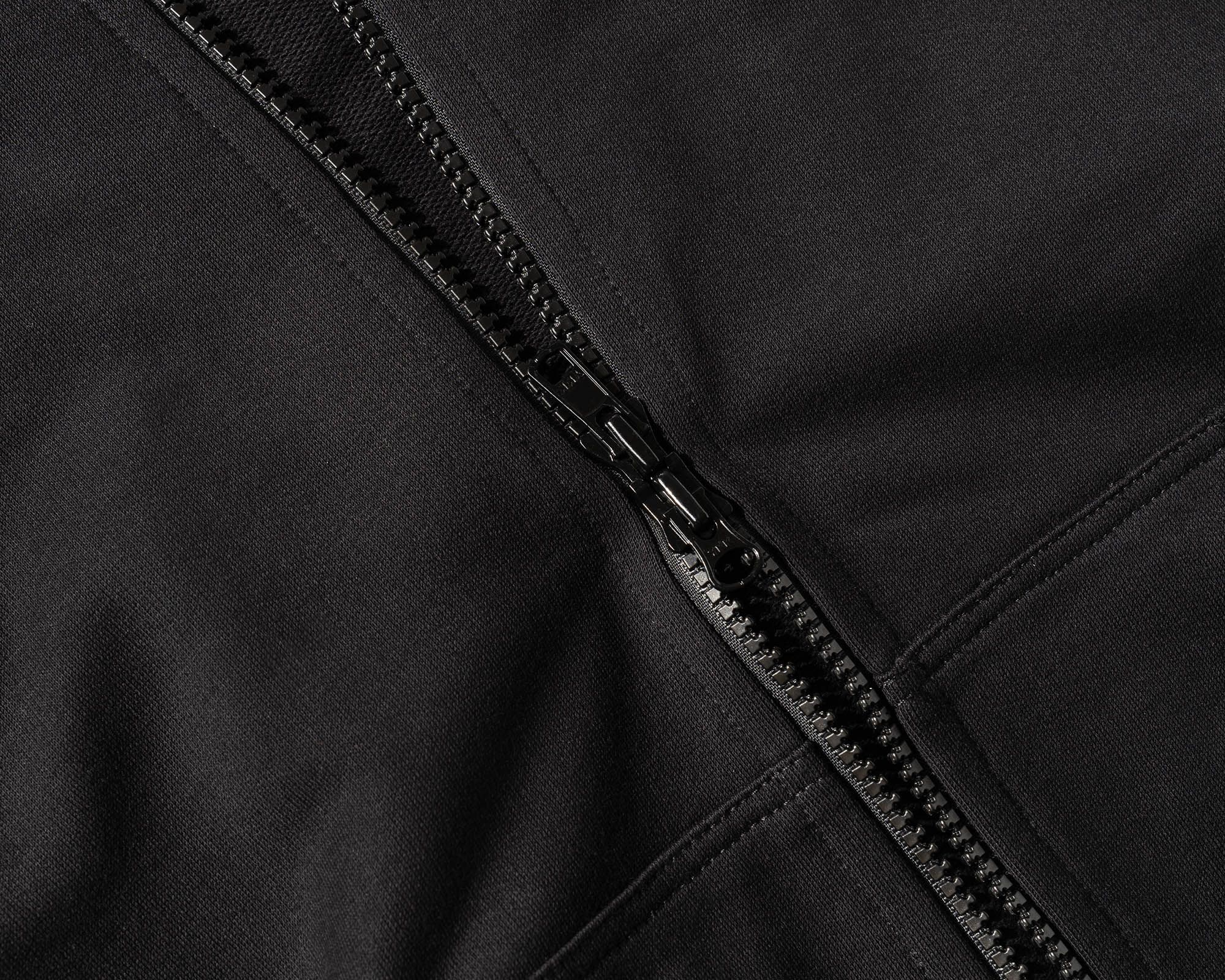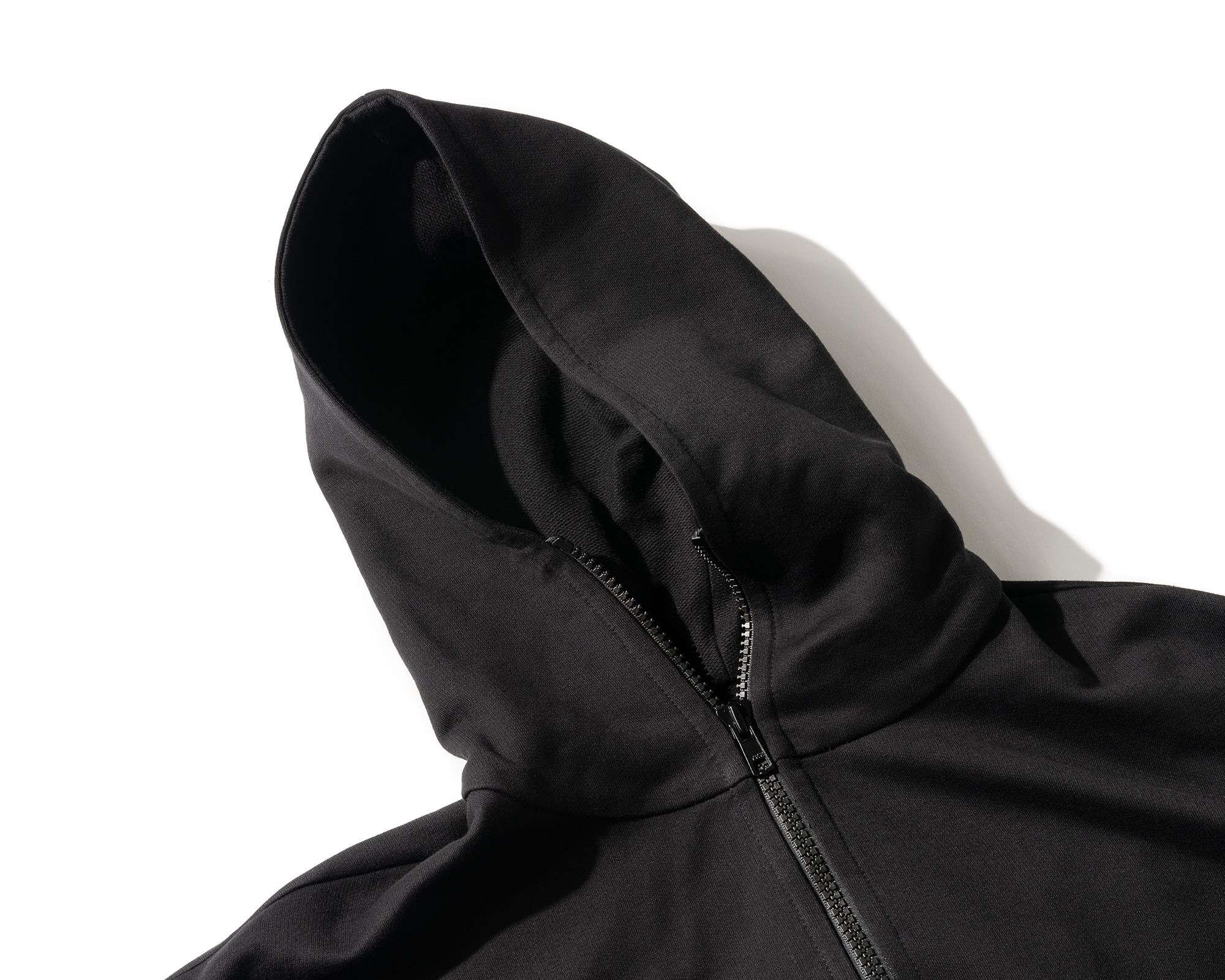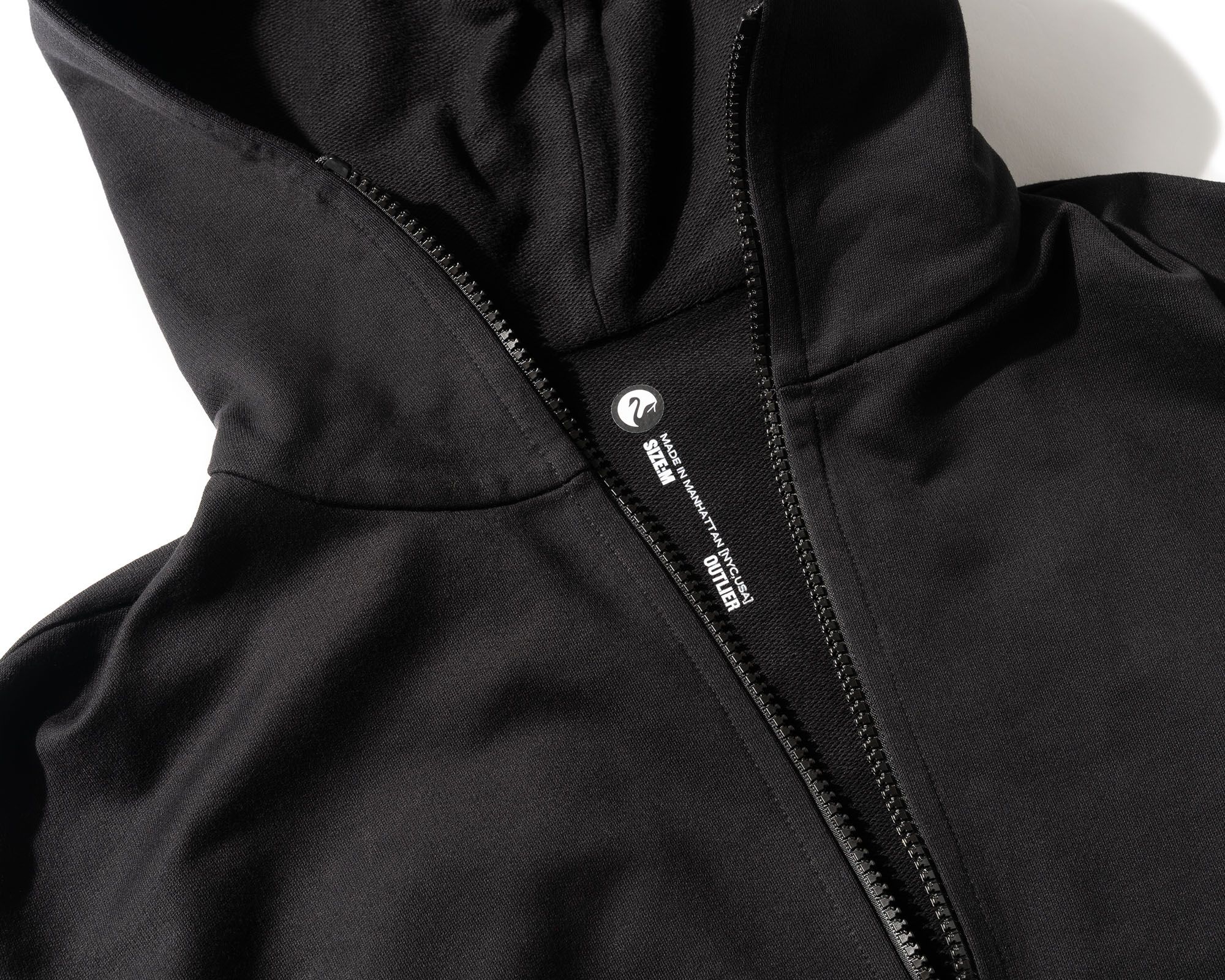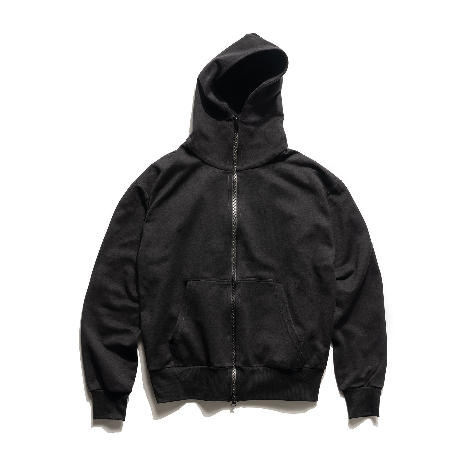 A cooler cotton hoodie experiment [#583] with an extended zipper for extra neck coverage. The Mercy/co fabric is a midweight 100% cotton terryback sweatshirt fleece, mercerized at the fabric level to burn off the fuzziness from the cotton. This opens up the fabric to allow for more air flow, while creating a crisp and protective structural feel.