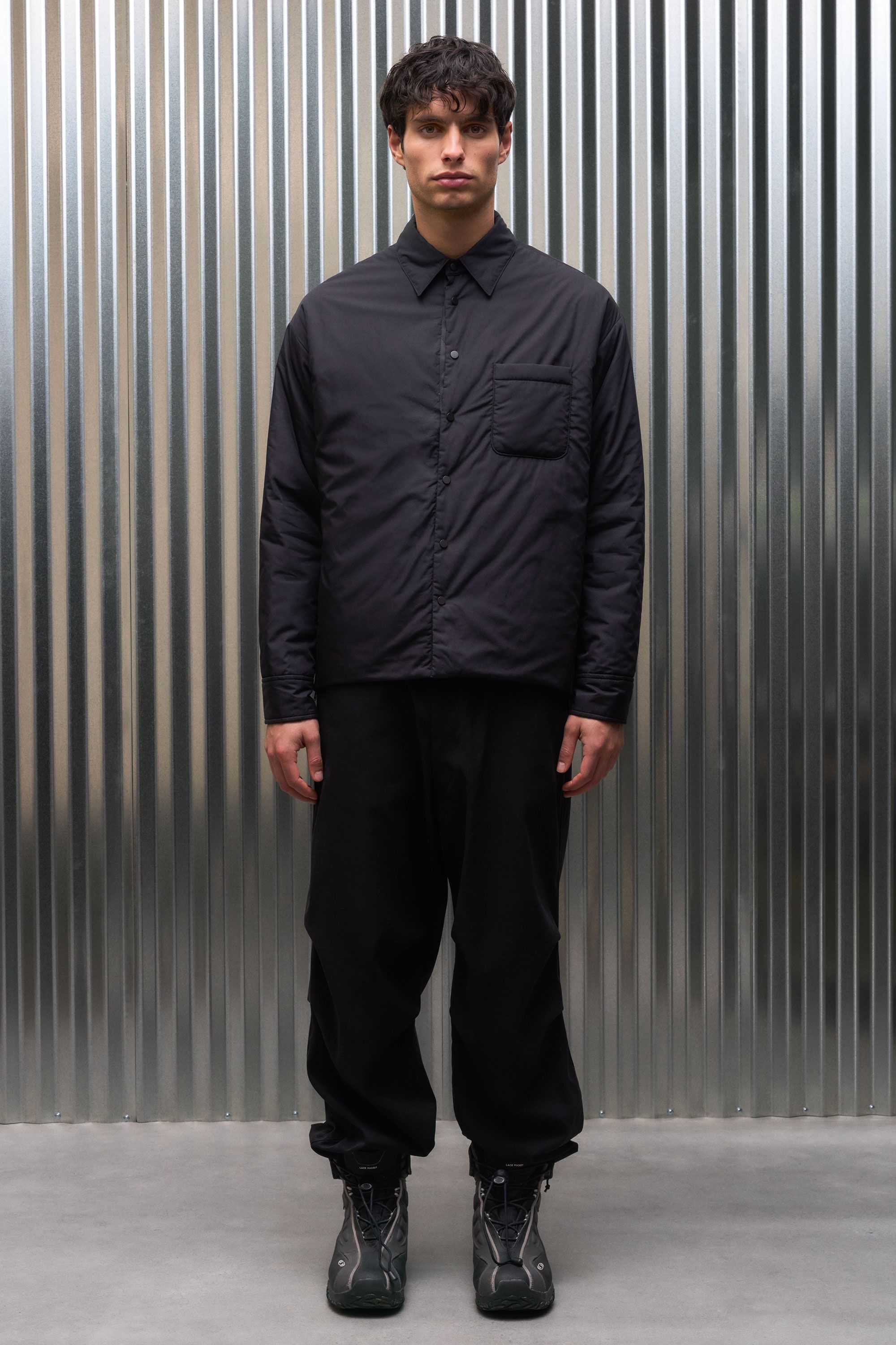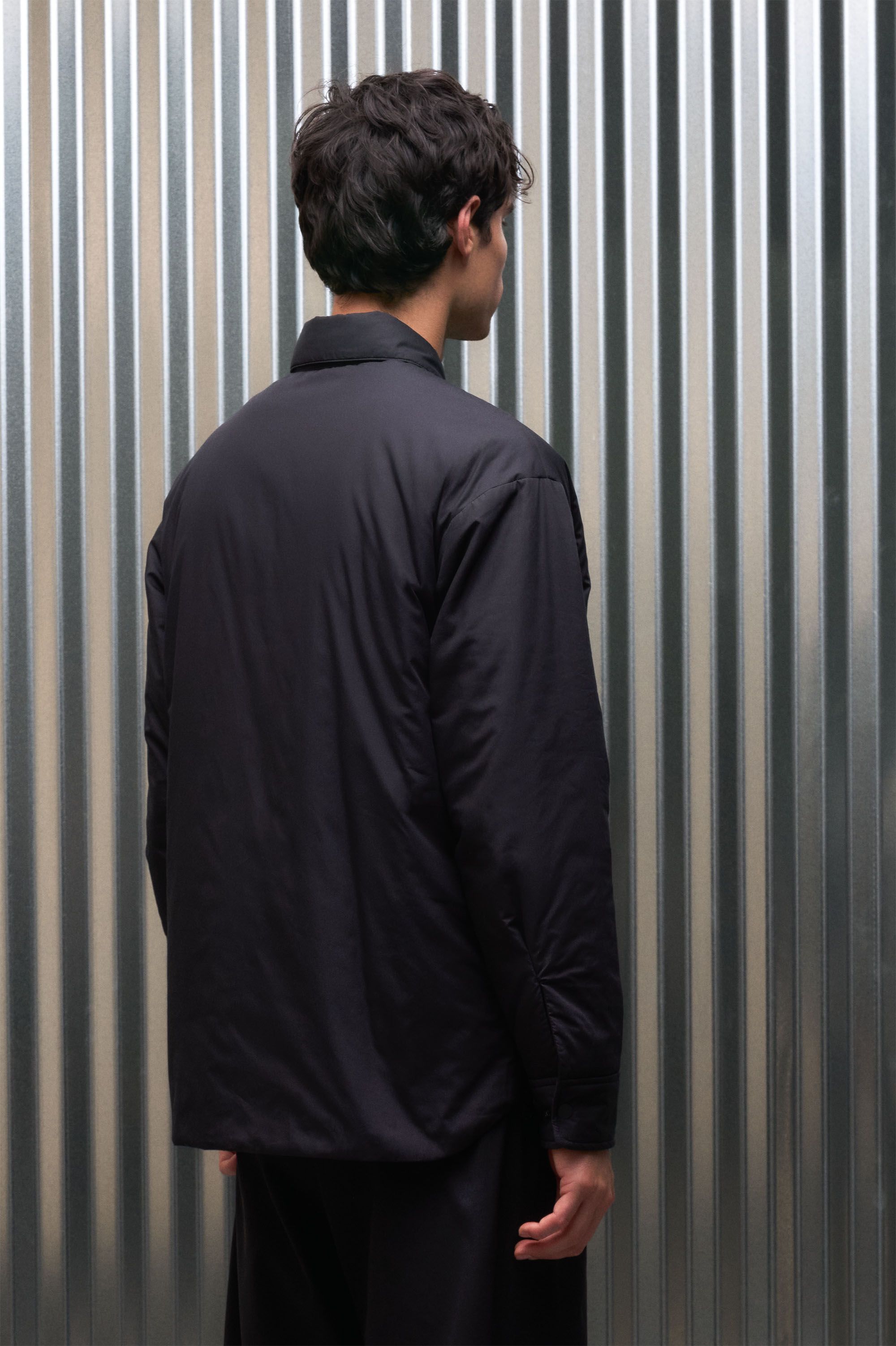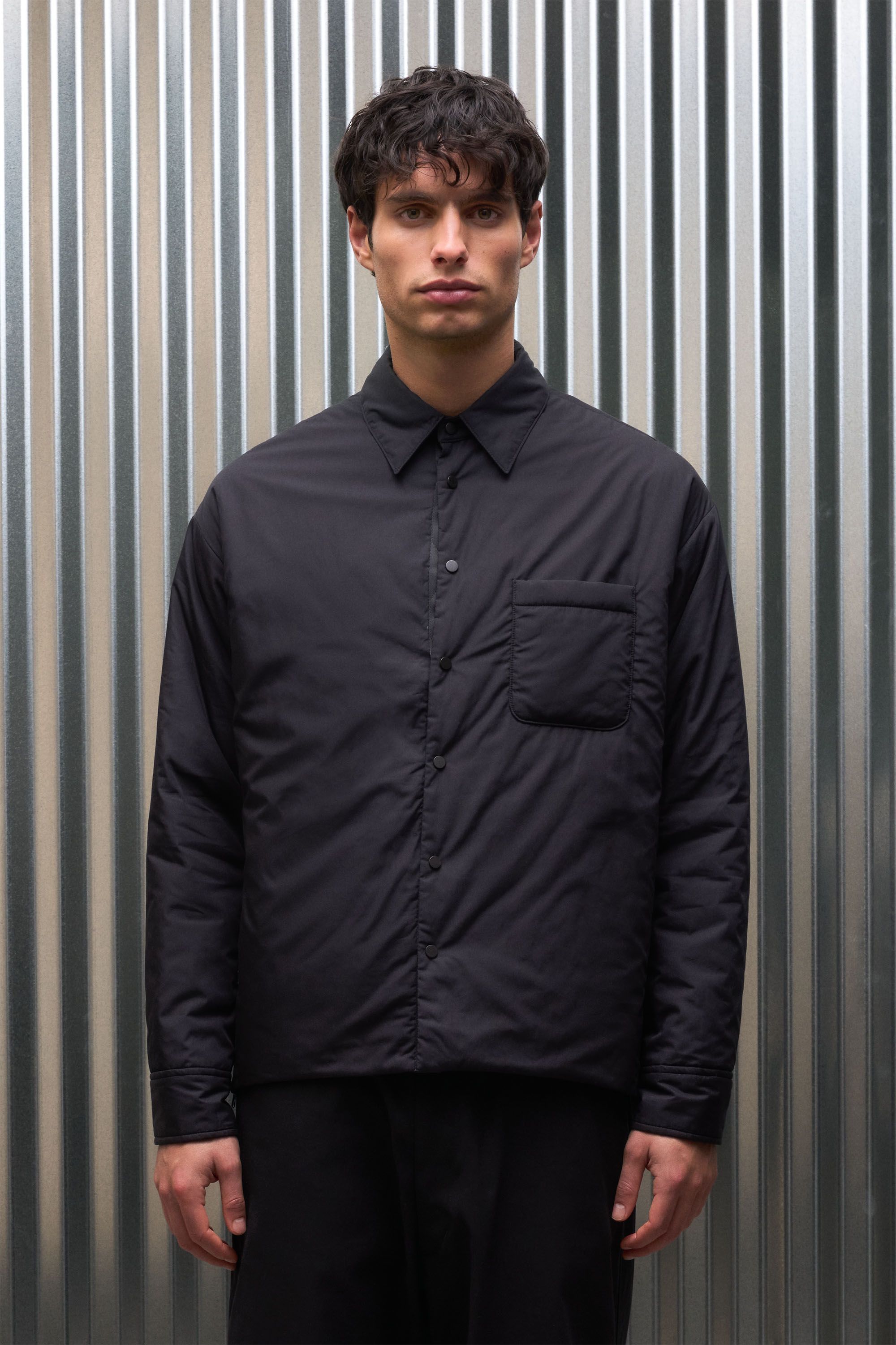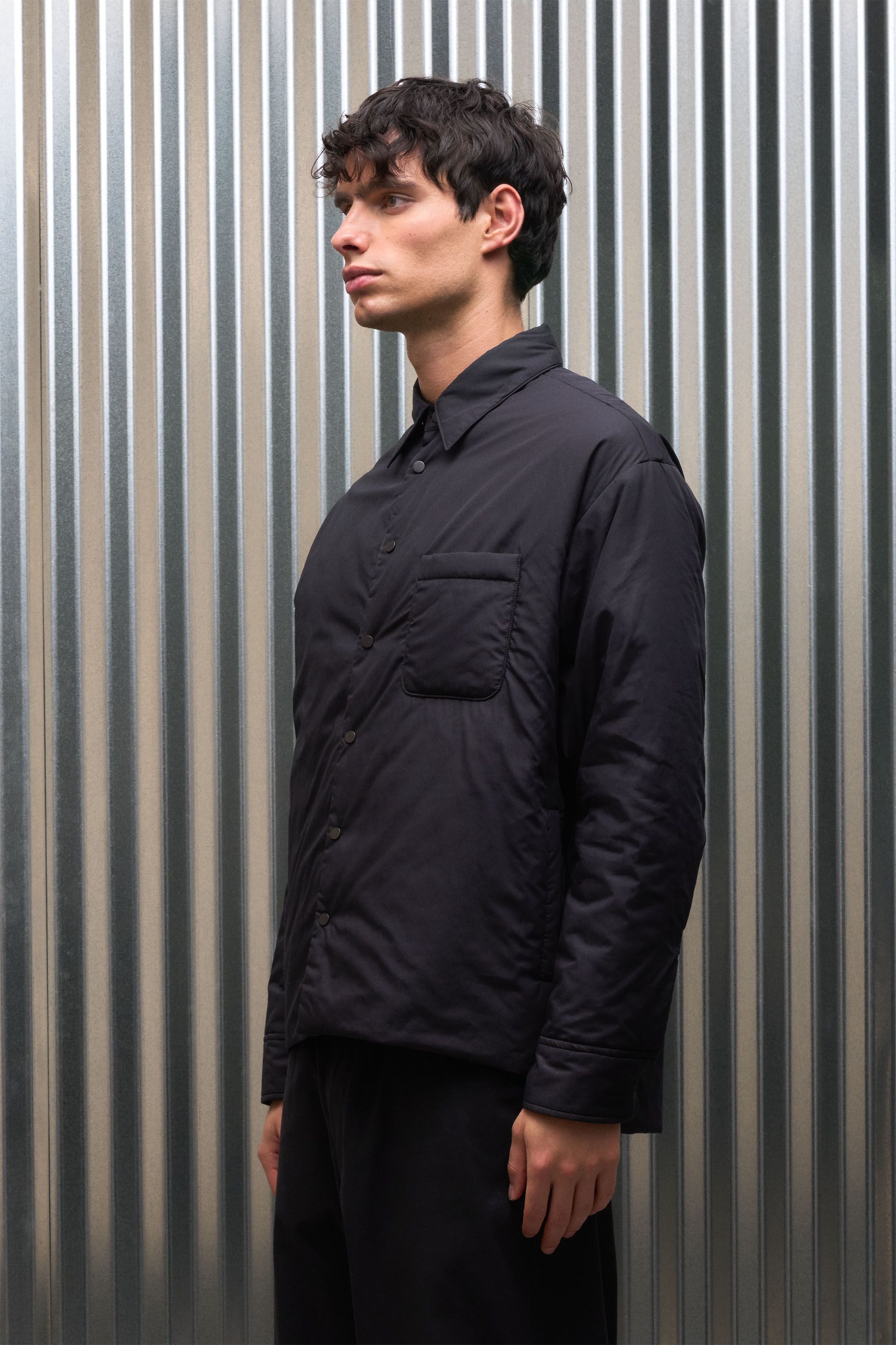 A splayed-open down shirt meets light jacket experiment [#571] in warmth without overheating. Zero snap front with finger garages. Two-way zippered sides allow the shirt to be vented from the hem to the forearm. Adown(45) is a lightweight, soft, breathable and 100% post-consumer recycled down system with a crisp cotton face. The coziness of a down comforter made into a very wearable layering piece for calibrated comfort.