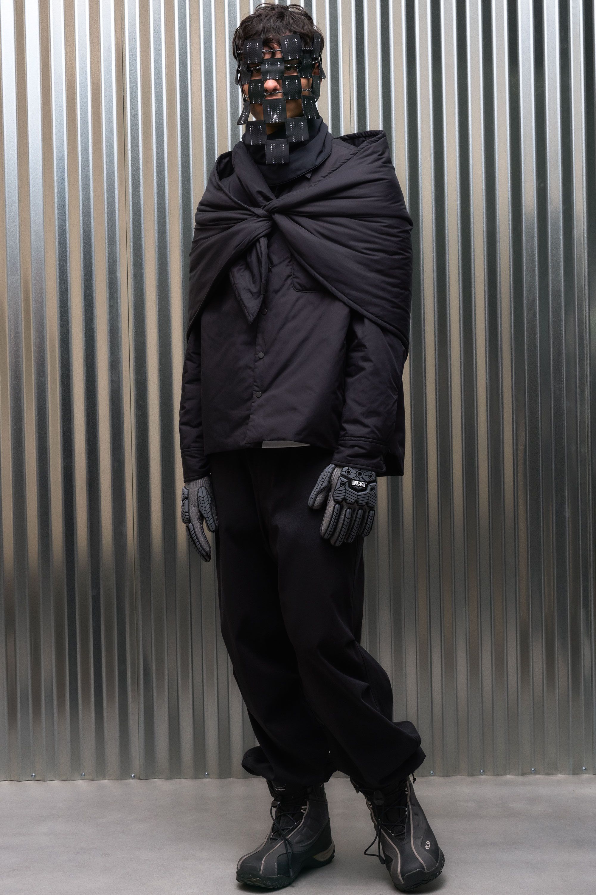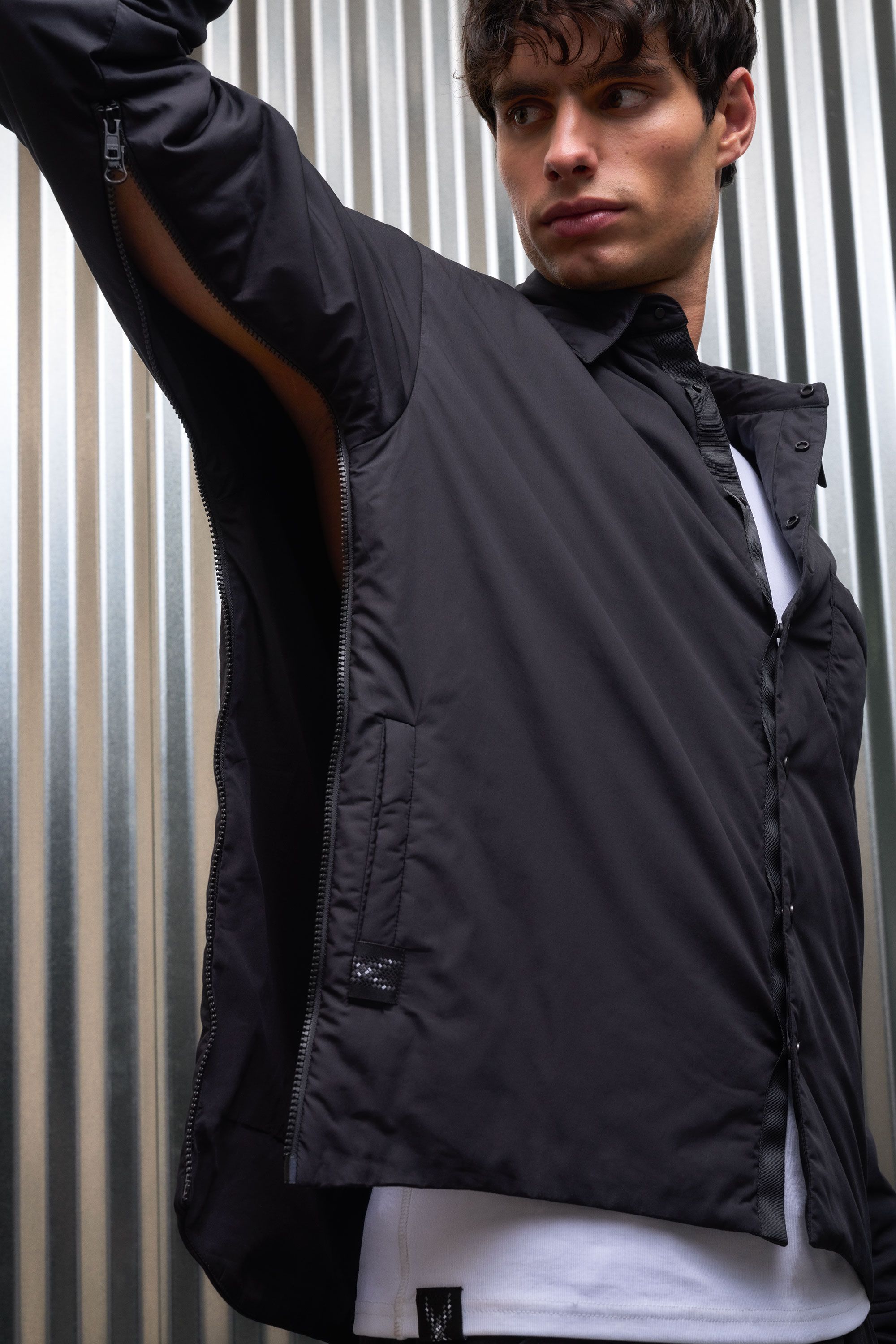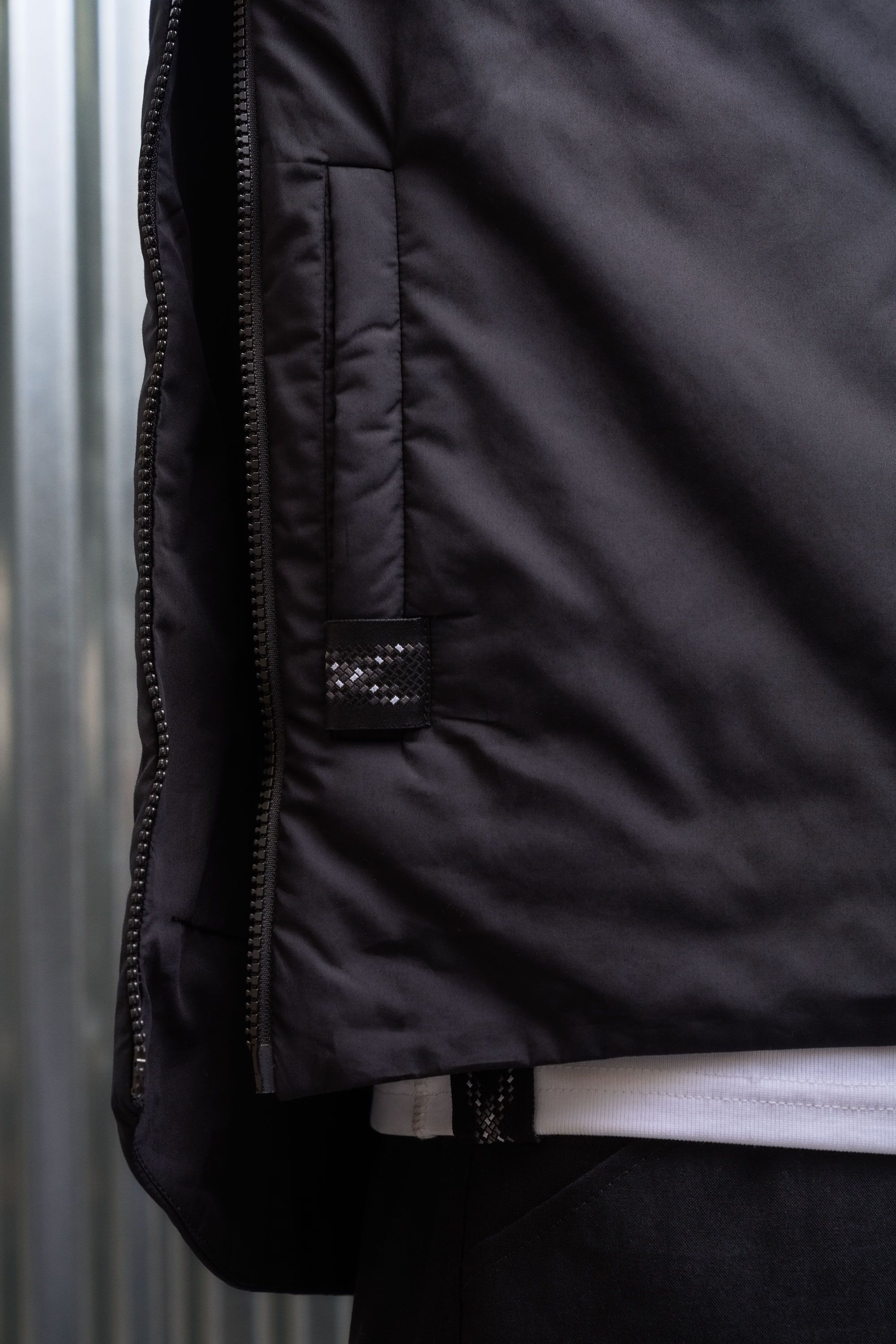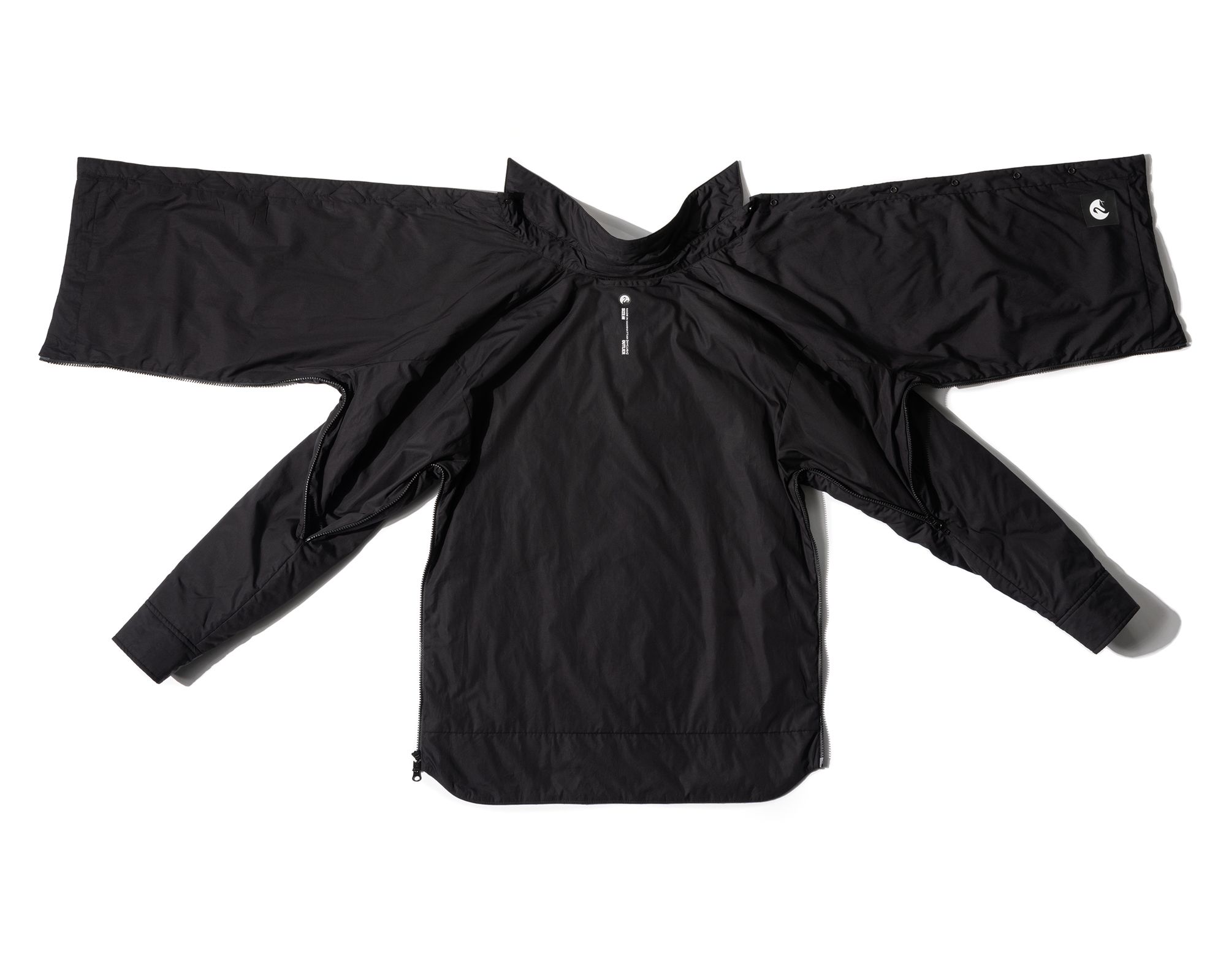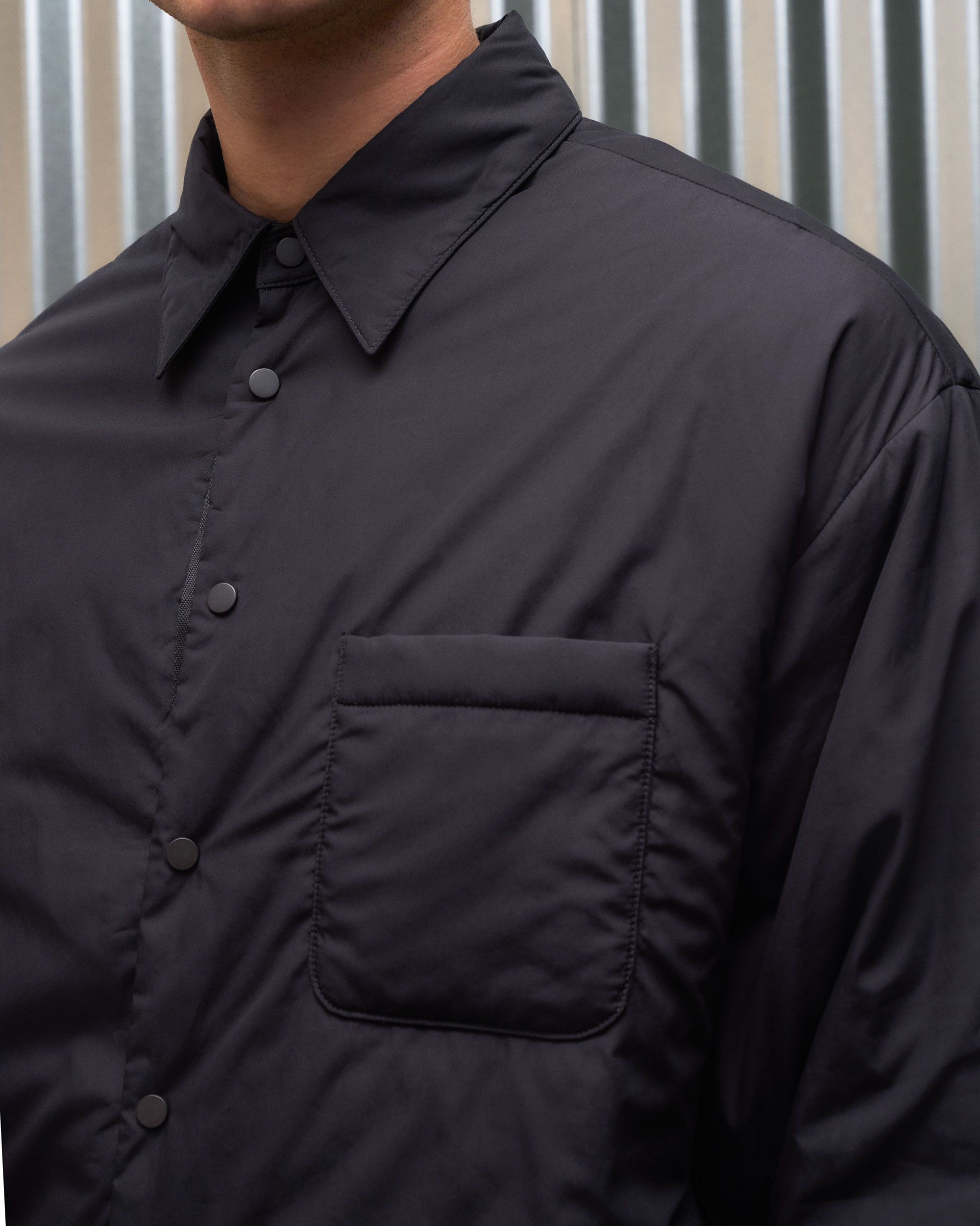 A splayed-open down shirt meets light jacket experiment [#571] in warmth without overheating. Zero snap front with finger garages. Two-way zippered sides allow the shirt to be vented from the hem to the forearm. Adown(45) is a lightweight, soft, breathable and 100% post-consumer recycled down system with a crisp cotton face. The coziness of a down comforter made into a very wearable layering piece for calibrated comfort.