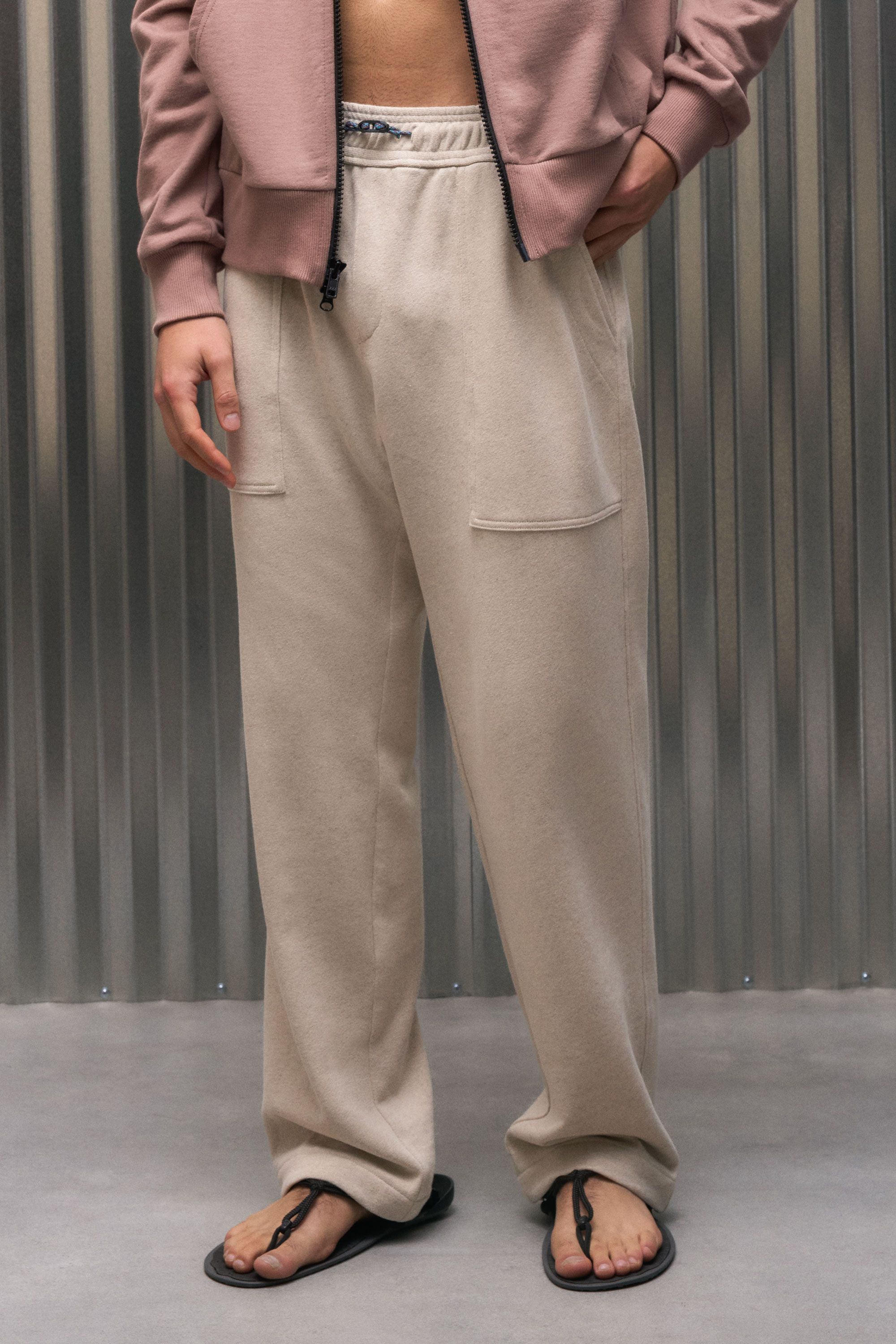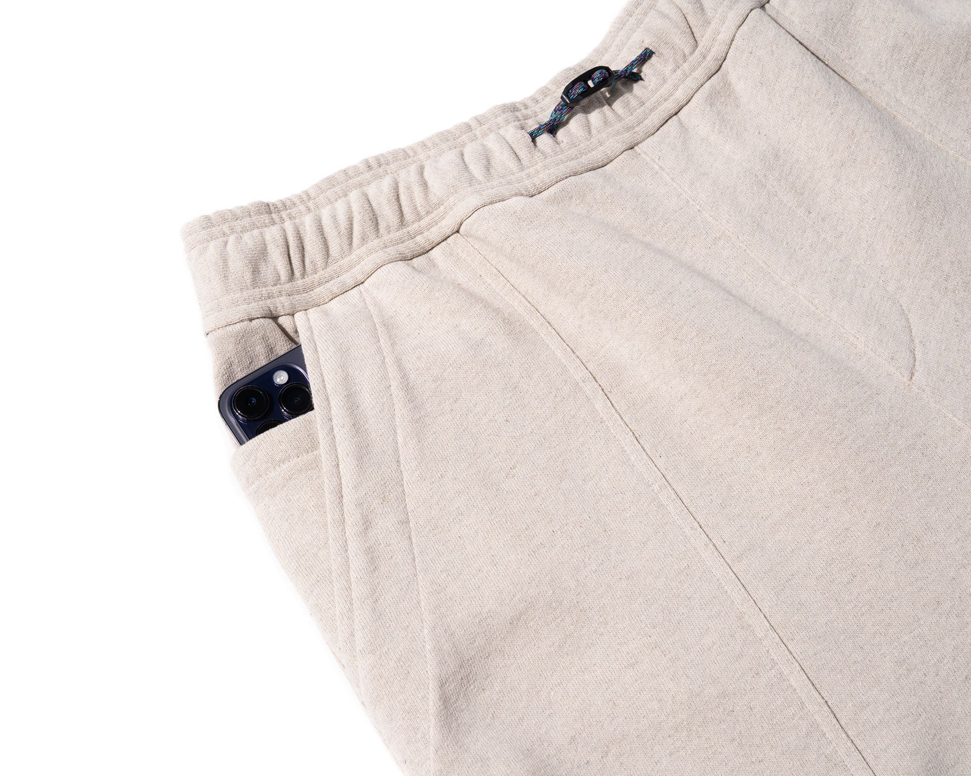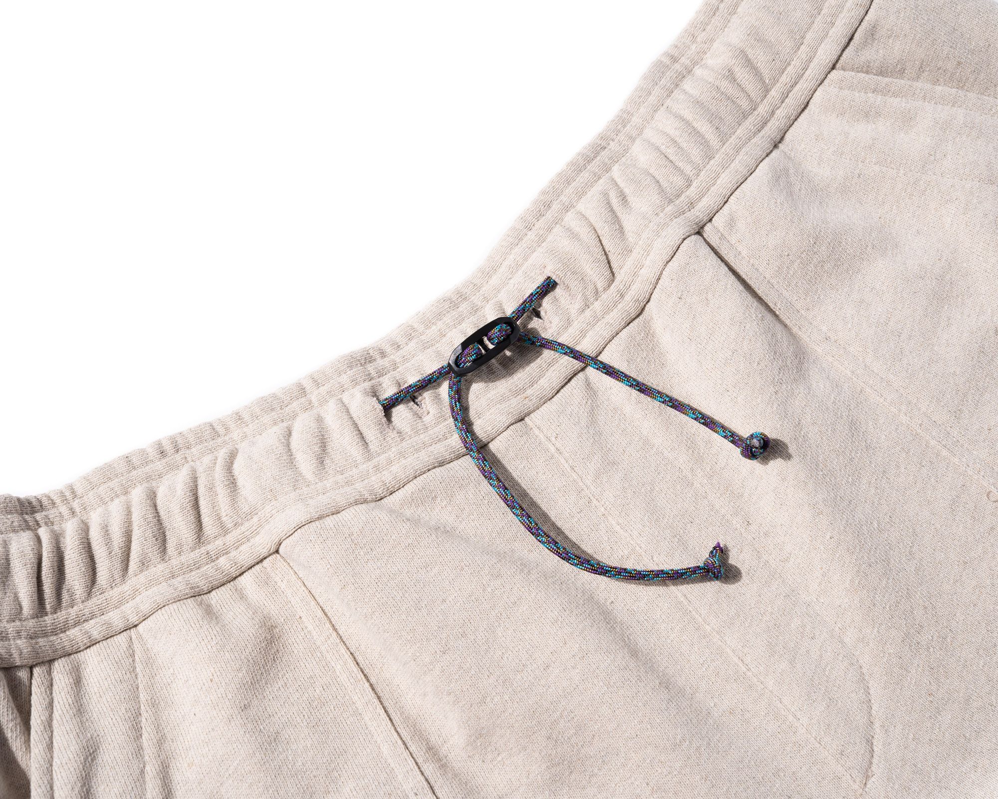A loose and slouchy fatigue-pocket sweatpant experiment [#572] in the relaxed and dry Easy/co Linen terryback fabric. Elastic waist with a 3Bar + paracord drawcord for comfort and adjustability. Fatigue style patch pockets plus a big fifth pocket in the front and keyloop in the back.