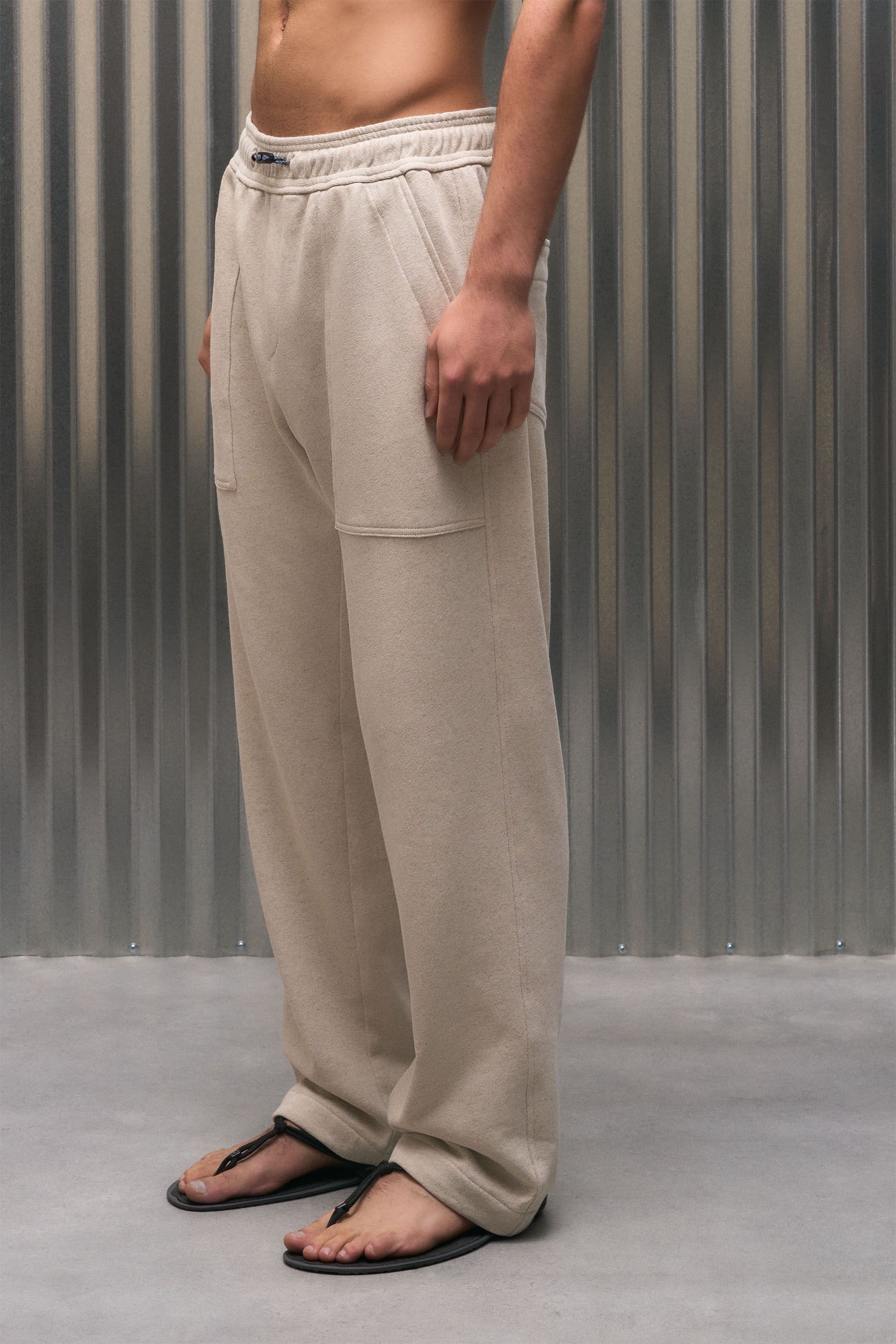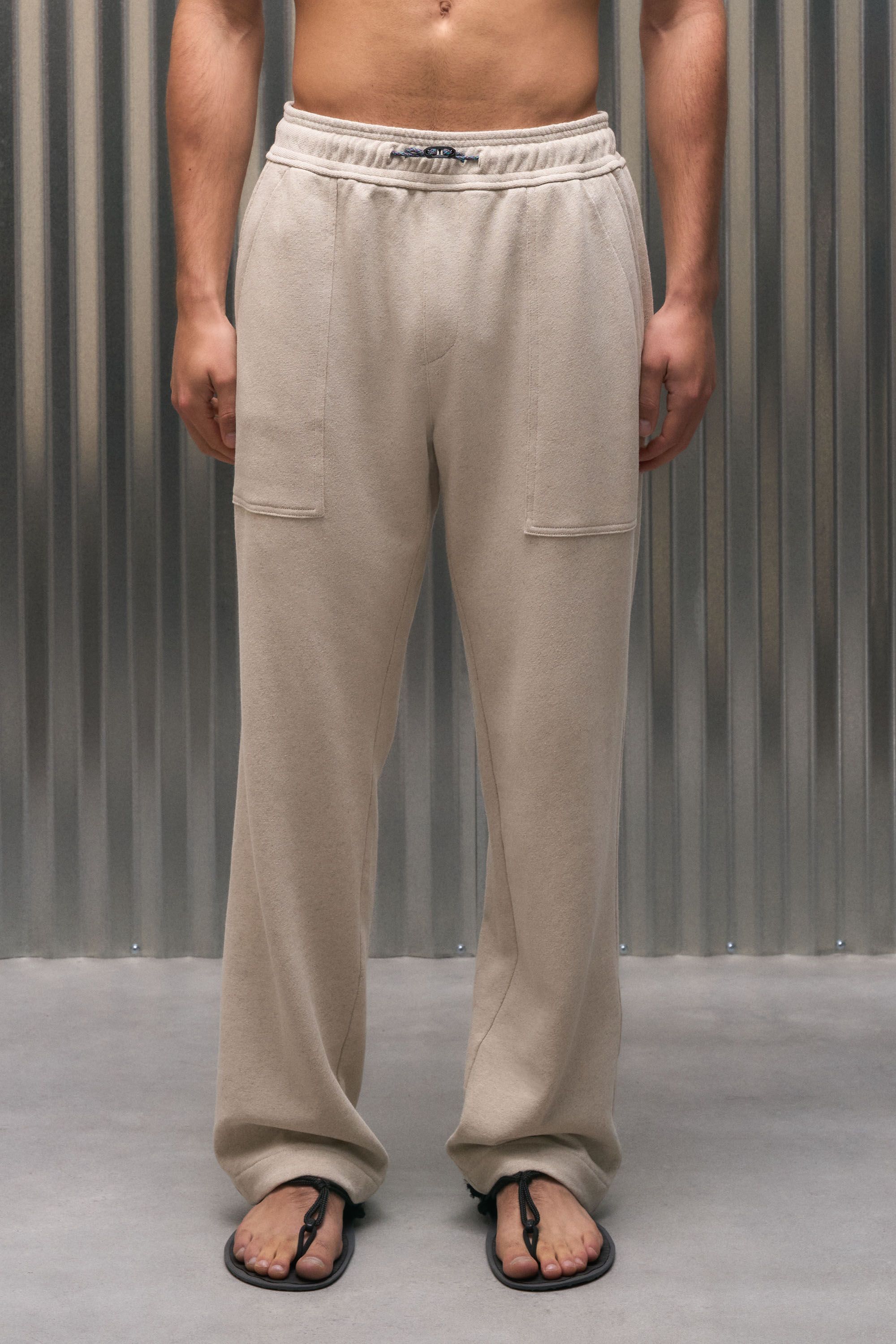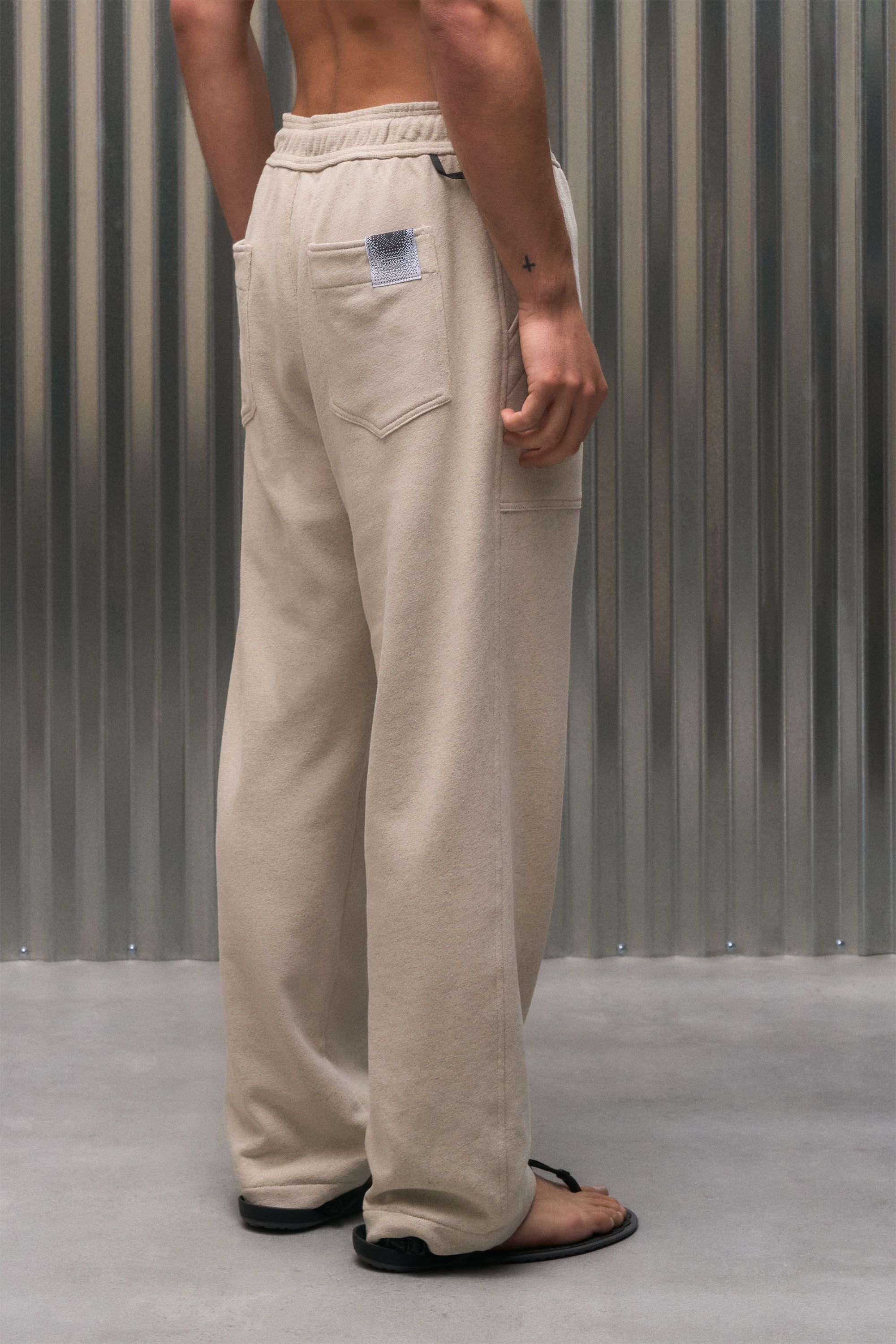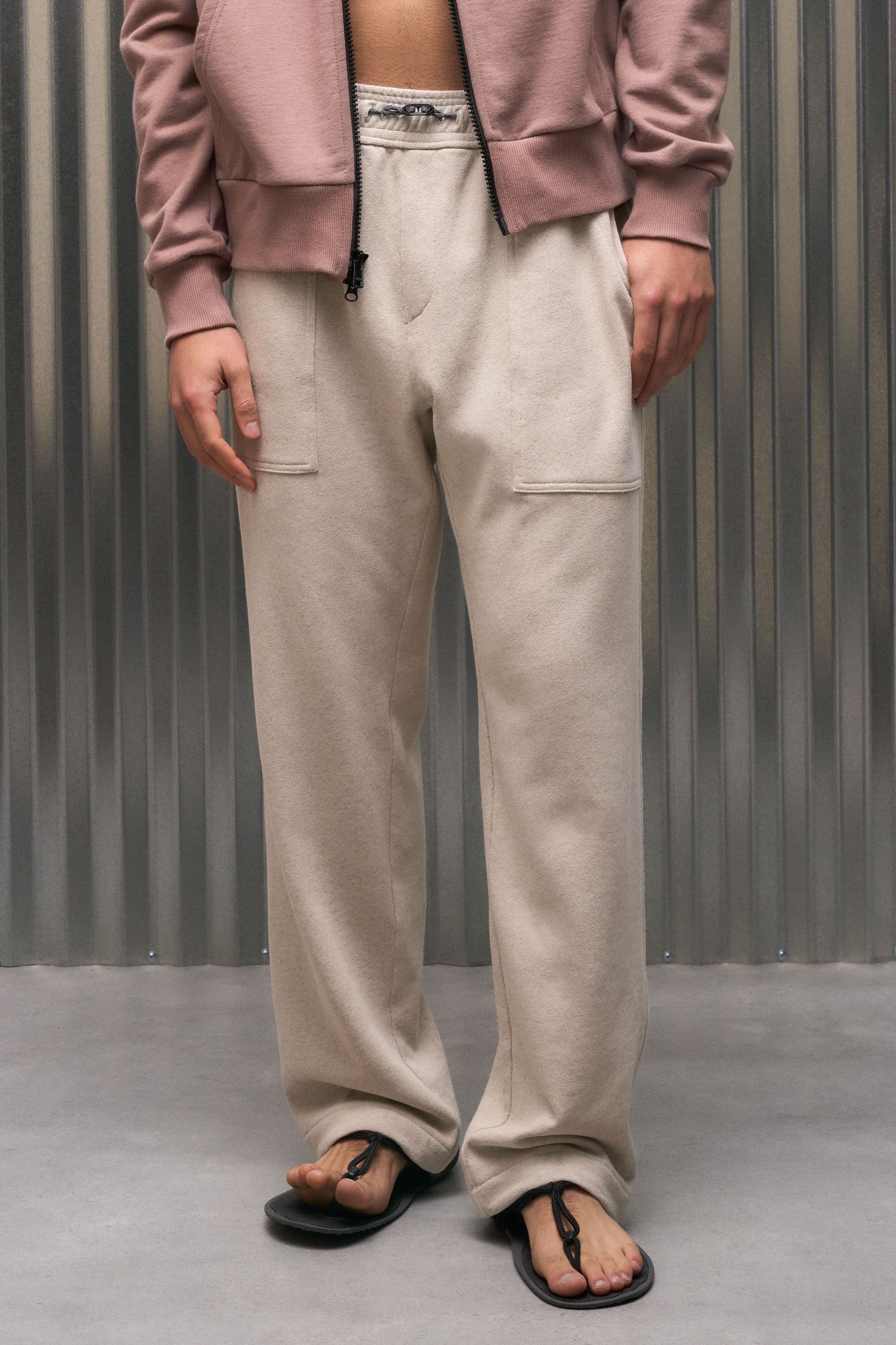 A loose and slouchy fatigue-pocket sweatpant experiment [#572] in the relaxed and dry Easy/co Linen terryback fabric. Elastic waist with a 3Bar + paracord drawcord for comfort and adjustability. Fatigue style patch pockets plus a big fifth pocket in the front and keyloop in the back.