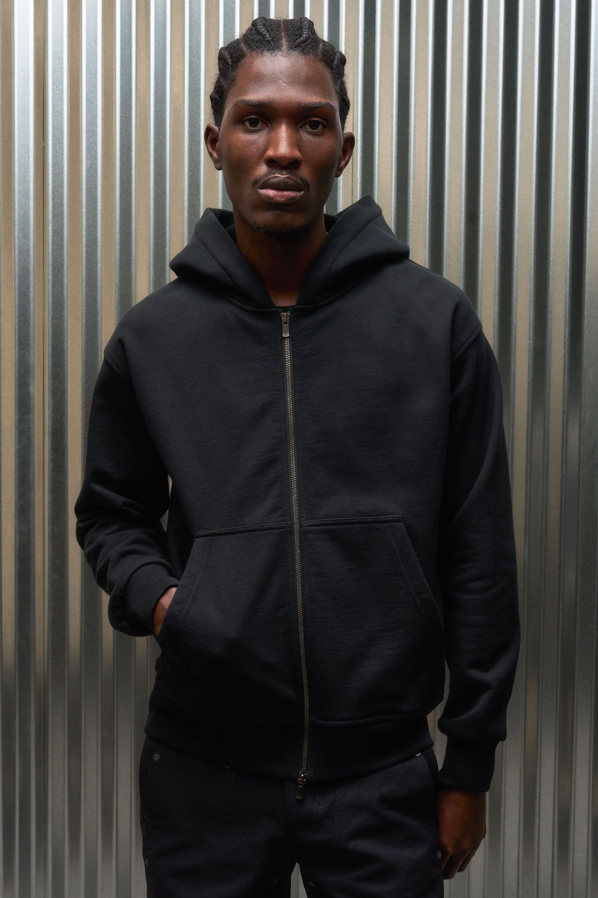 Emotional armor in the form of a two-way zippered hoodie. High density cotton on the outside for serious structure and form. Soft merino terry on the inside for all the warmth and natural performance merino brings. A smooth and polished Excella #5 two-way zipper pulls it all together.