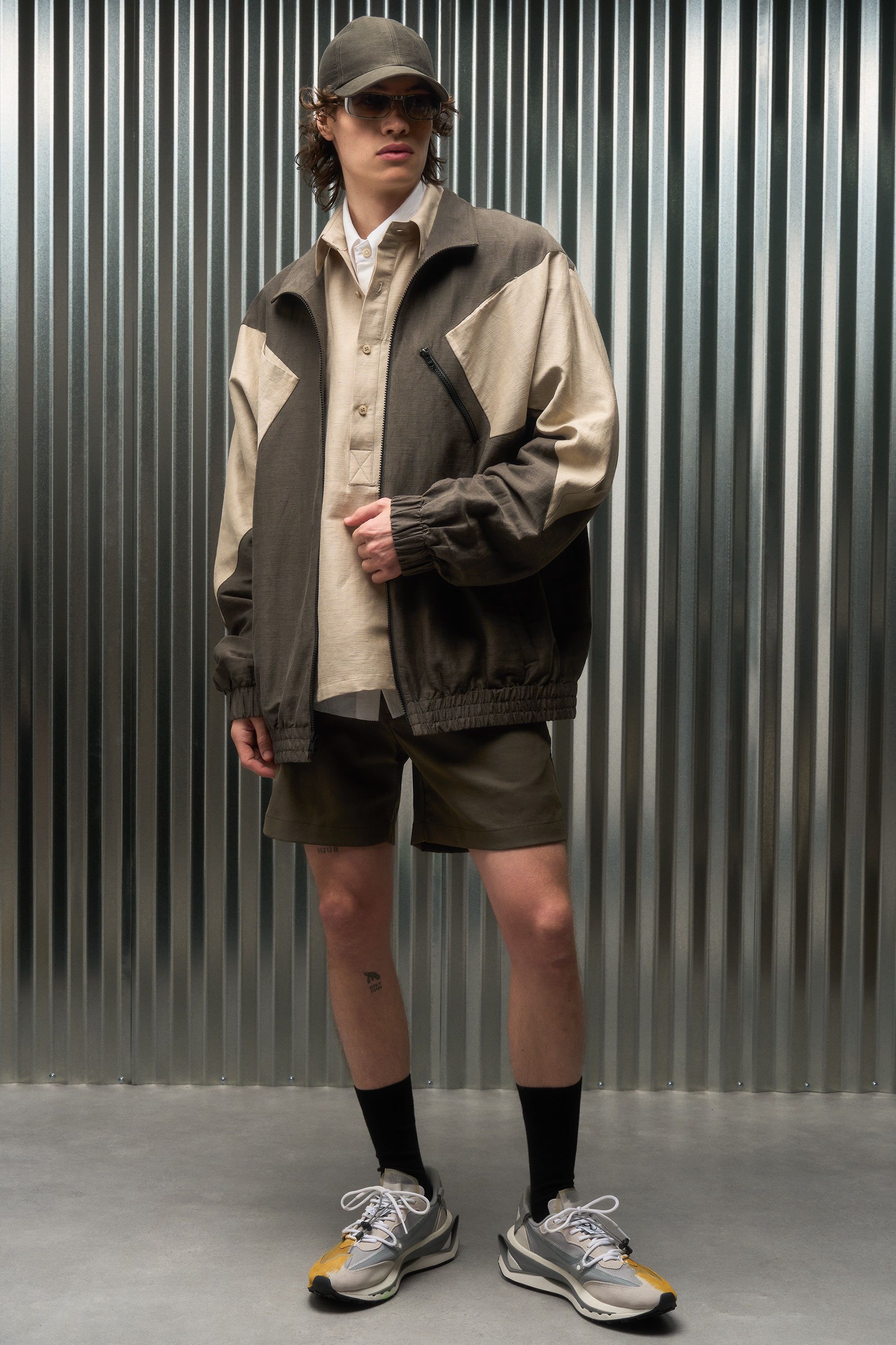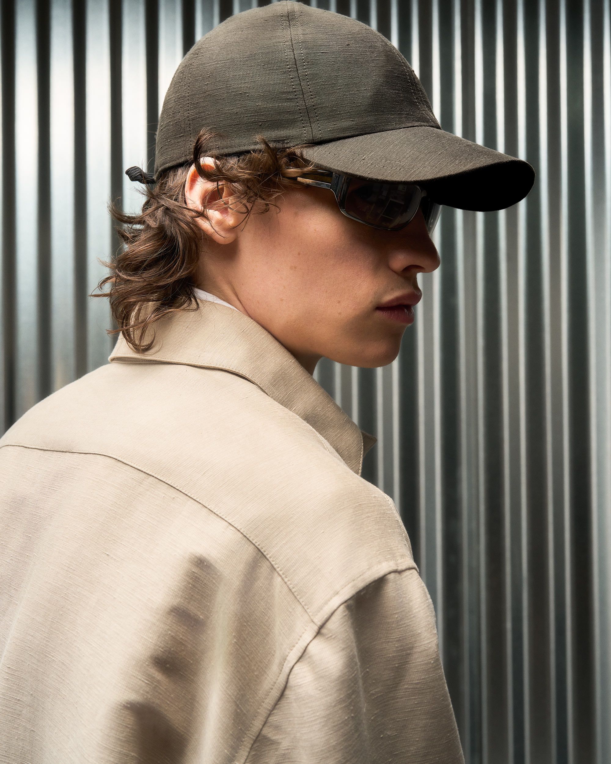 A super light polyester warp mesh is knitted around a linen weft insertion to combine the durability and stability of polyester with the cool wear and character of a bast fiber. The linen is 59% of the fabric weight and its slubby texture and elegant aging shine through. The polyester warp means it doesn't crease sharply like most linen but instead takes on a gentle waviness that makes it far easier to travel with.