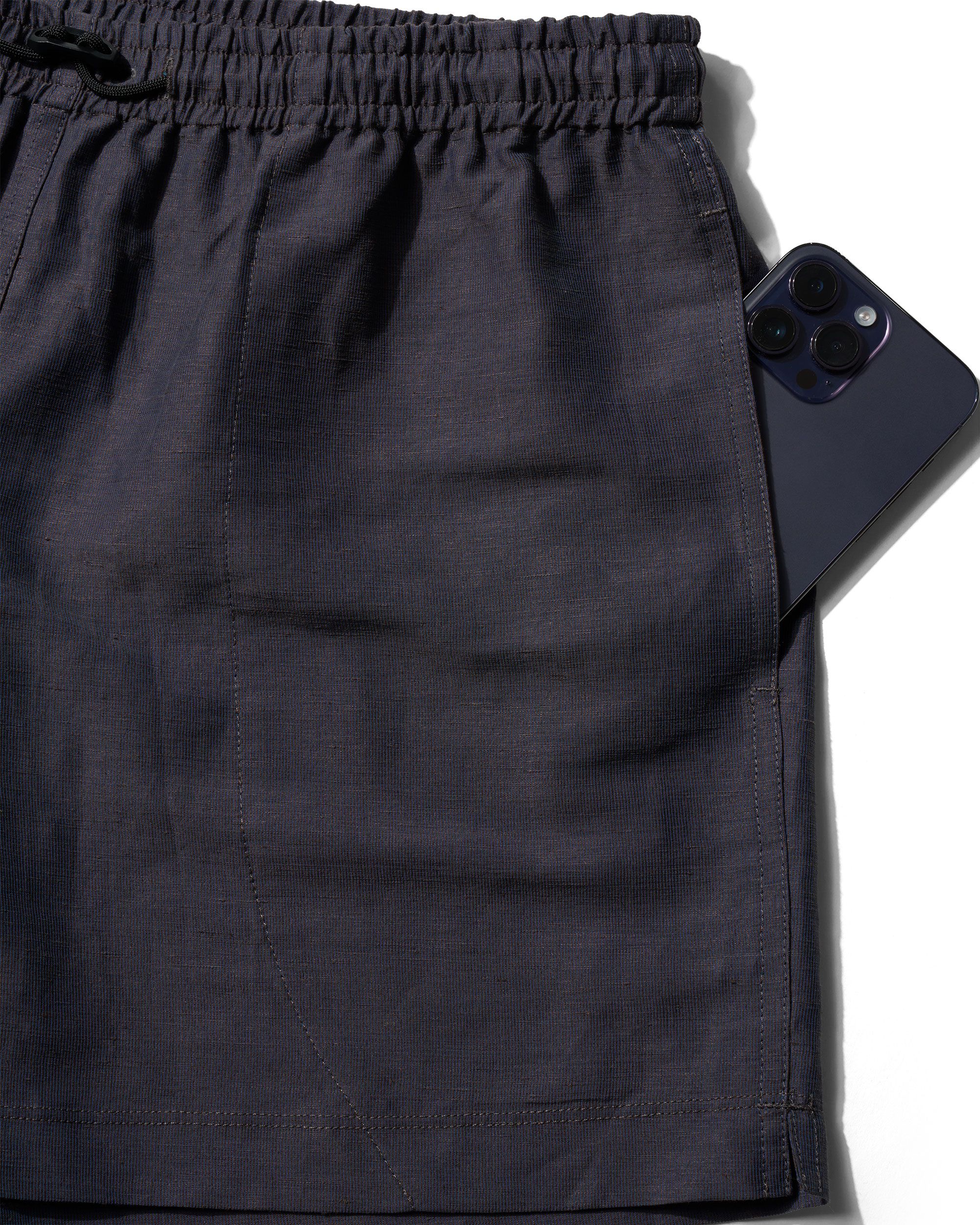 A short like air, cut light and loose with a 4.5” inseam. The open yet opaque Injected Linen fabric allows for maximum airflow and just enough modesty. Crossover front pockets minimize bulk, an elastic waist with an inside/outside 3Bar + paracord 550 adjust and a rear patch pocket round things out.