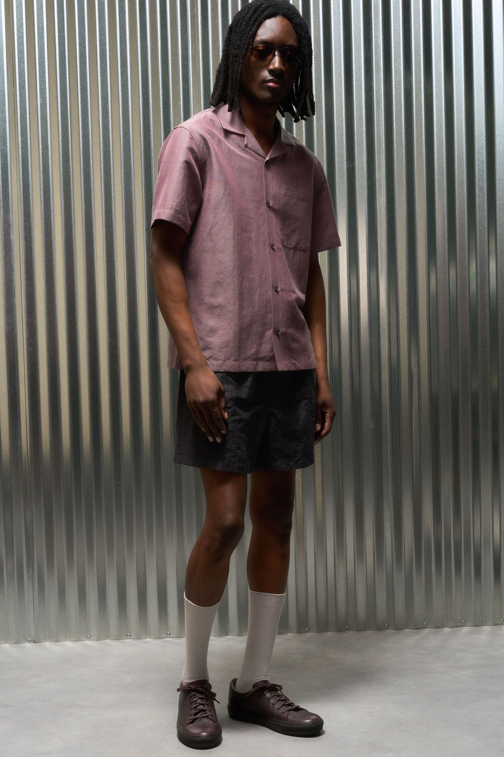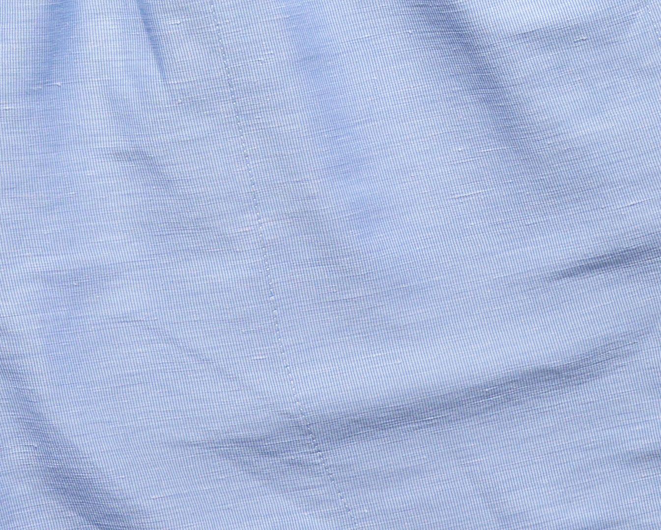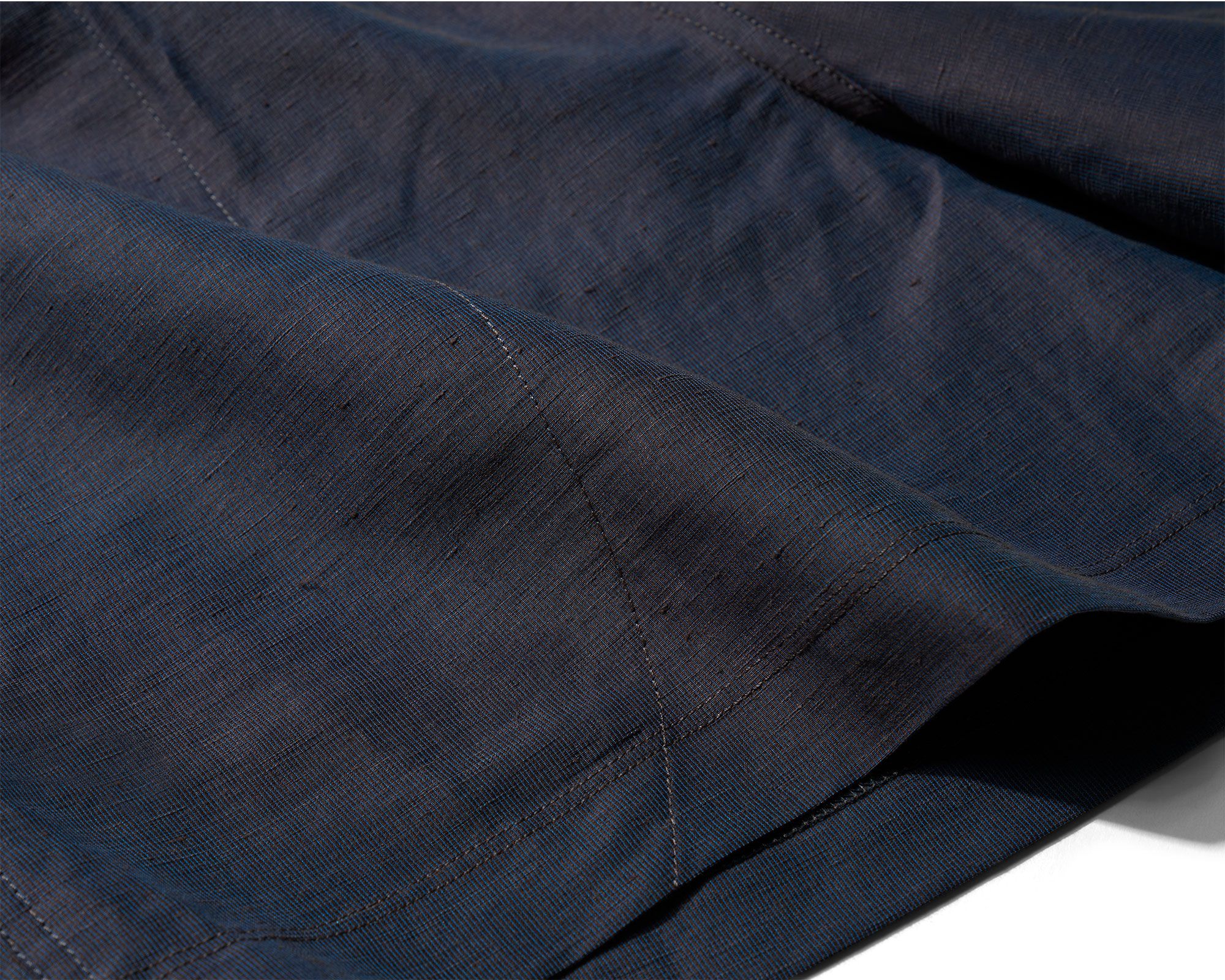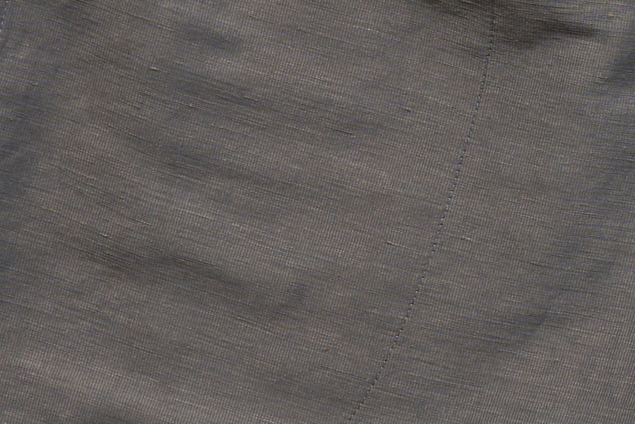 A super light polyester warp mesh is knitted around a linen weft insertion to combine the durability and stability of polyester with the cool wear and character of a bast fiber. The linen is 59% of the fabric weight and its slubby texture and elegant aging shine through. The polyester warp means it doesn't crease sharply like most linen but instead takes on a gentle waviness that makes it far easier to travel with.
