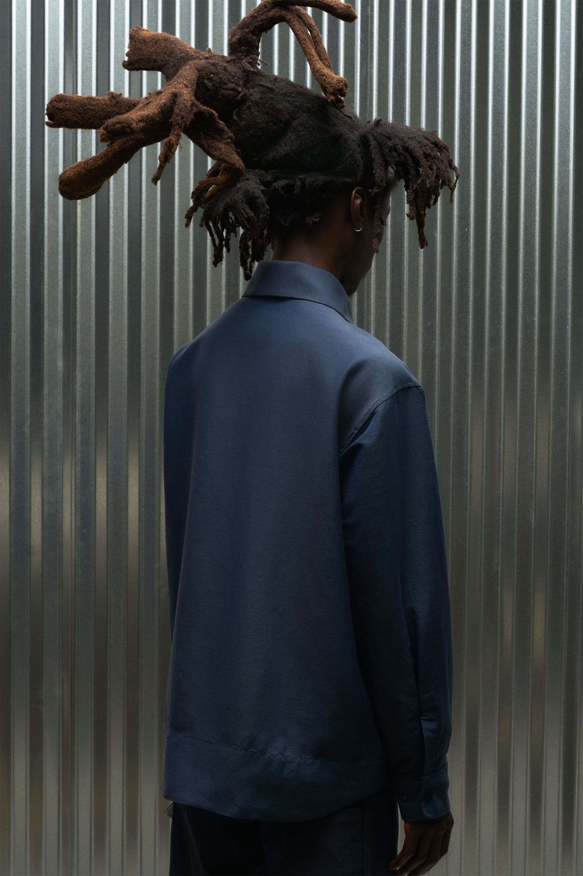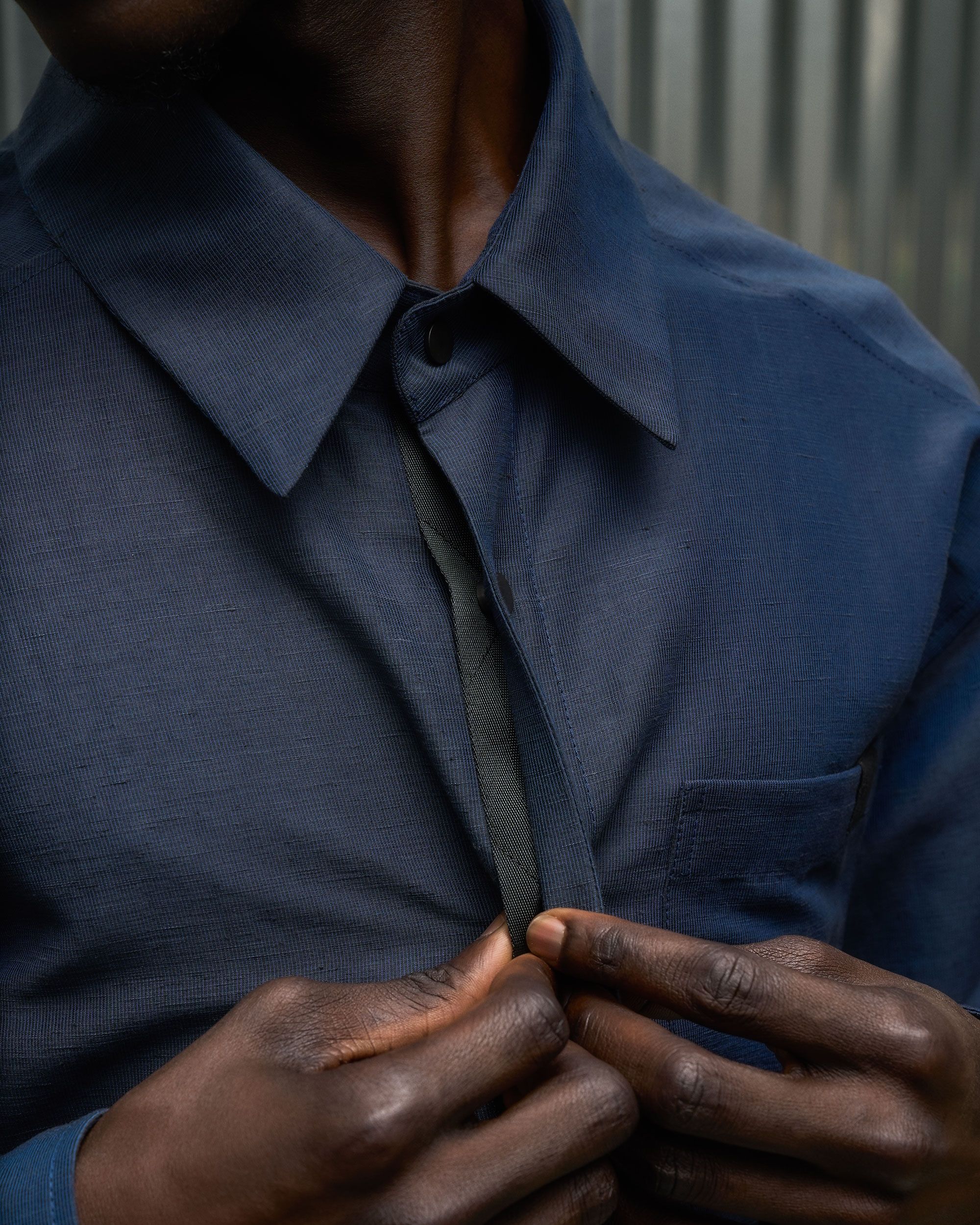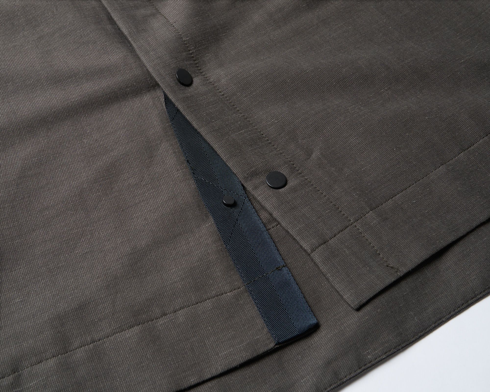 A super light polyester warp mesh is knitted around a linen weft insertion to combine the durability and stability of polyester with the cool wear and character of a bast fiber. The linen is 59% of the fabric weight and its slubby texture and elegant aging shine through. The polyester warp means it doesn't crease sharply like most linen but instead takes on a gentle waviness that makes it far easier to travel with.